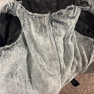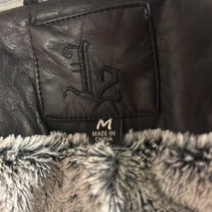 Faux leather jacket. Has a hood but can be taken out by zipper. Inside is lined with faux fur. Super cozy and stylish!