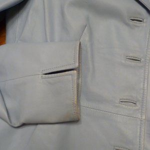 Talbot's Leather Jacket, Light Blue, 8P. Soft Leather, Front Slash pockets, Peplum back, Fold back cuffs, Lined. Some normal wear on right sleeve end but only slightly visible when cuff is turned back. Also a pale spot on the lining by the left back from the dry cleaners.