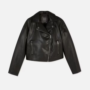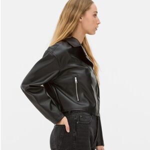 This sleek black faux-leather moto jacket is the perfect layering piece for any season. With its silver zipper details, notched collar, and flattering cropped fit, it adds instant attitude to any outfit.