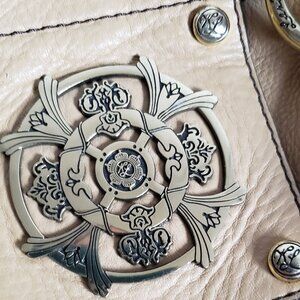 Gorgeous signature gold detail on flap, KL in the center. Logo on rings, studs and lining.
