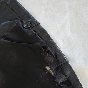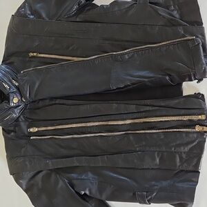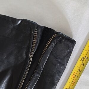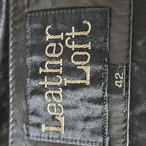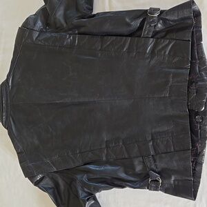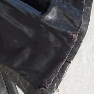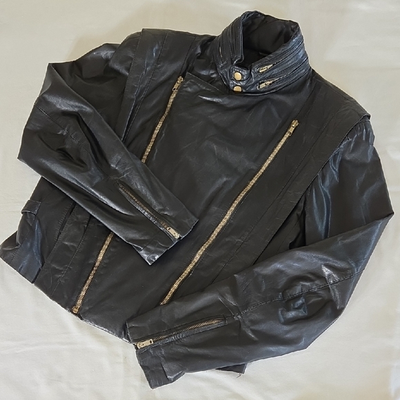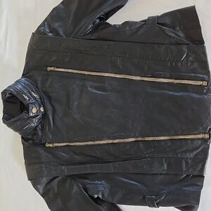 GUC biker jacket. We sold our motorcycle in 2005, so this has just been hanging in the closet. The brass zippers were quite tarnished, so I worked them over with some Brasso, but they are still showing some spots. The lining is frayed around the hem area. There is a nylon hood hidden in the collar, which I think has never been used. Two side pockets, one inside pocket, and one hidden pocket (photo #4). Please see photos for approximate measurements taken flat.