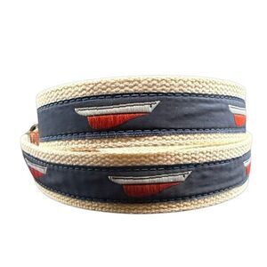 Leather Man Ltd. Belt Mens Size 42 Navy Leather Brass Buckle Woven Sailboat