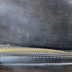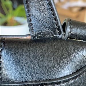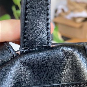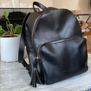 KC Jagger from Off Saks mini black leather backpack. Good used condition. The perfect shape and size for a small fashion backpack. Gold tinted hardware, classic tassel pull on front pocket. Note that the top pull strap is starting to wear a little thin. The zipper on the bottom pocket can be finicky and could use repair if you don’t want to mess with it. I loved this and searched a long time to find the perfect shape and sized leather small backpack. This is it!