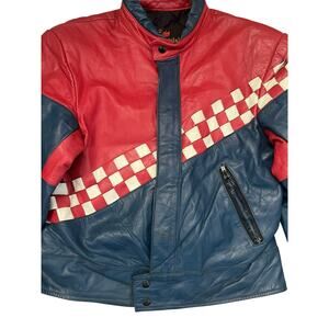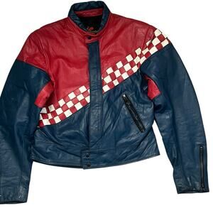 Leather Motorcycle Jacket Mens Vintage Moto Cafe Racer Biker Rider Retro Red White Blue 80s 90s