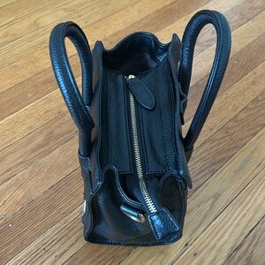 Elegant black and white leather handbag, perfect for any occasion. Features a sleek design with a convenient front pocket.