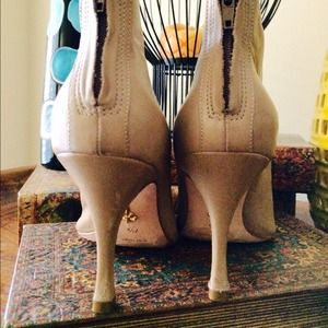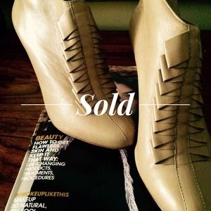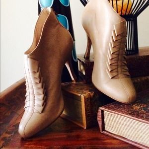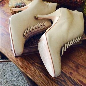 Leather Nude Ankle Boots. Ruffle design detail. approx. 3 inch heel. Great Pre-owned Condition. By Pour La Victoire.