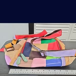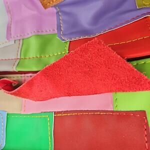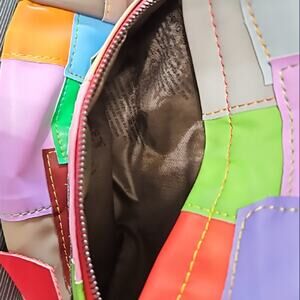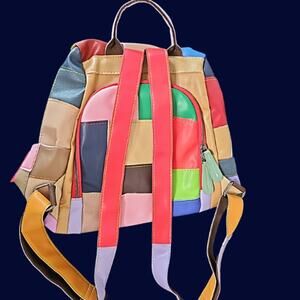 This vibrant and unique leather patchwork backpack is sure to turn heads! It features a beautiful array of colors and a stylish patchwork design.