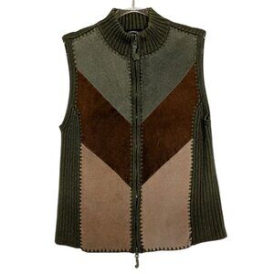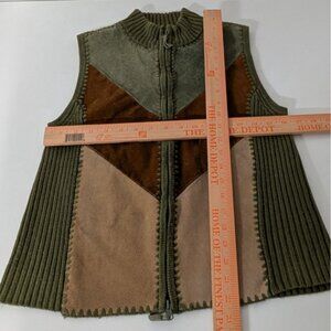 Leather Patchwork Vest Womens Size Medium Green Ribbed Knit Full Zip Boho