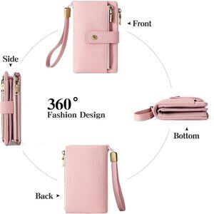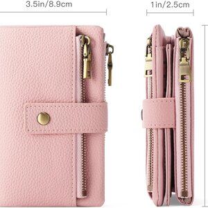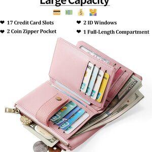 Features: Crafted from soft synthetic leather that gets even better with use, this compact wallet is perfect for slipping into your crossbody or clutch. It features 17 credit card slots, 2 ID windows, two zippered coin purses, and a full-length compartment — everything you need for organized, on-the-go style. The RFID-blocking technology keeps your info safe from unauthorized scans, giving you peace of mind. The detachable wristlet strap adds extra convenience, making it easy to carry as a clutch.