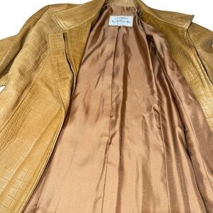 Stunning vintage-style Leather Renditions by Sandi genuine Italian soft lamb leather jacket featuring a beautiful crocodile-embossed texture in a rich mustard yellow tone. This tailored piece has a structured fit with a full lining, side pockets, and a front zip closure. A rare and eye-catching jacket that elevates any outfit from jeans to evening wear.