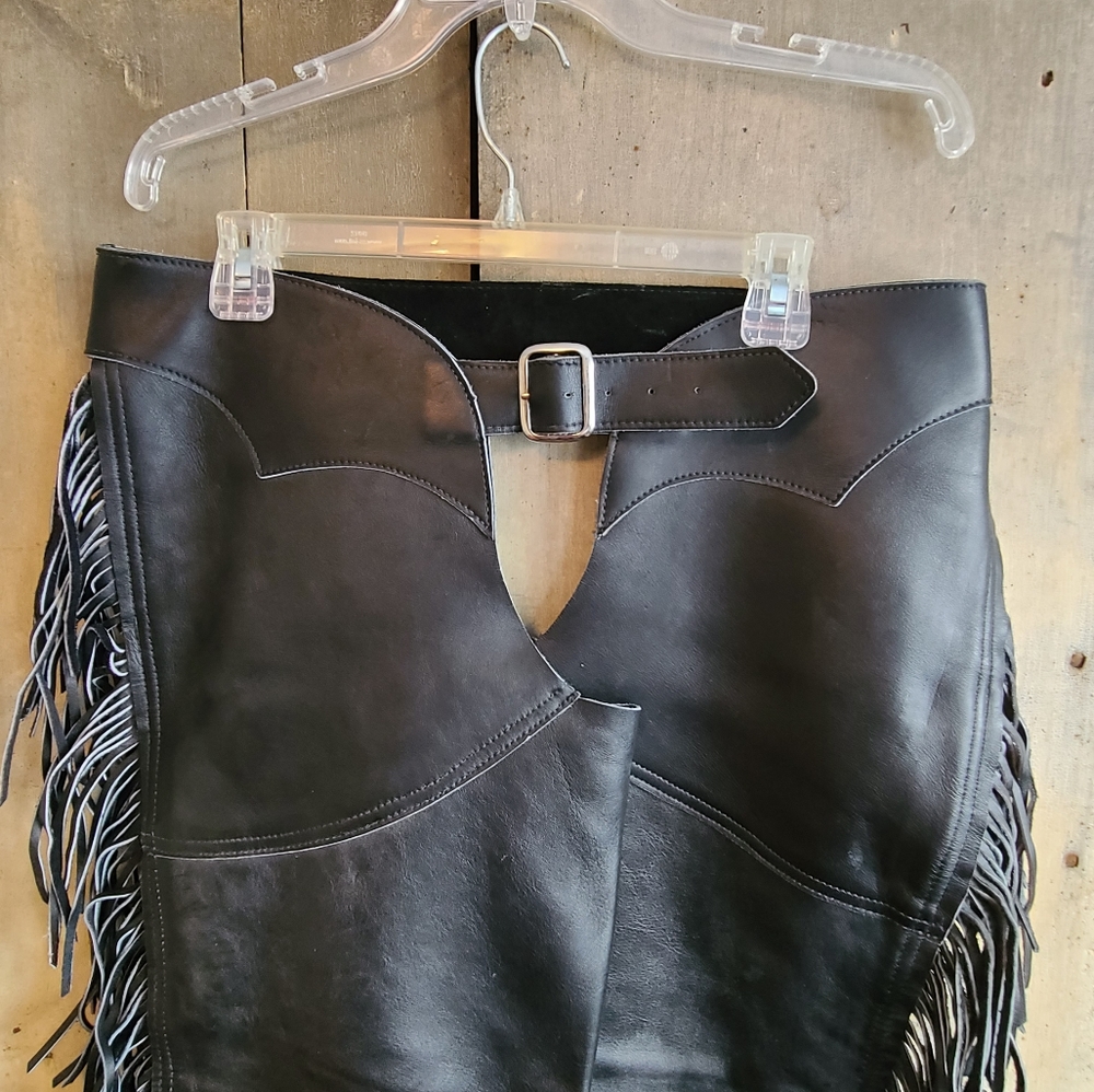 Like new condition, worn just a couple of times. Quality MC gear. Fringed on the outside leg. Nice flattering cut and fit. See measurements and adjustable fit. Beautiful quality chaps. see next to last photo, one of the 2 fasteners has a slight discoloration which may or may not restore