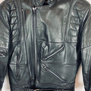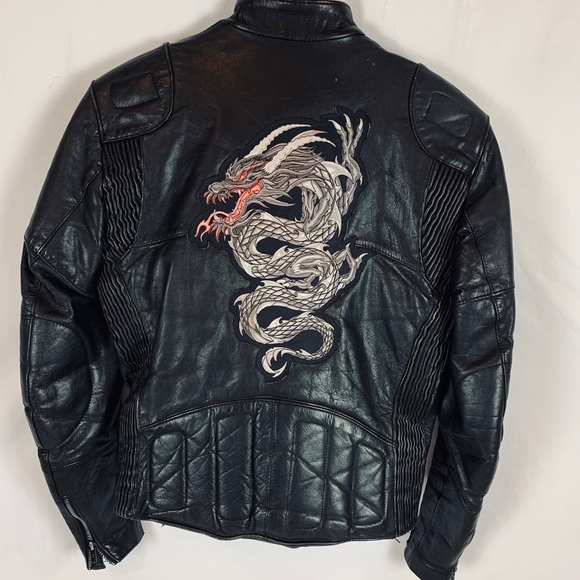 Size small leather riding jacket. Dragon detail on back. Measures 20” from pit to pit. There are a couple of minor spots on the back top right (see pics) otherwise in very good condition.