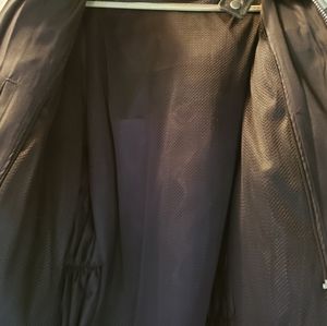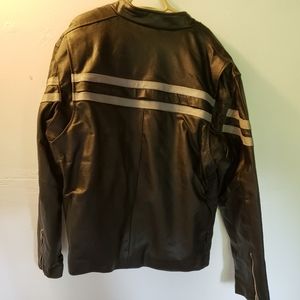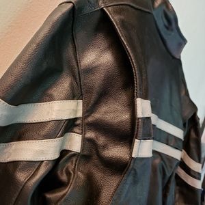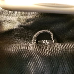 Leather Motorcycle Jacket XL. Never worn. In great shape. Black with gray marking and accents. This is a heavyweight jacket. It has the basic liner and the zipper to zip in an additional lining. The jacket is not branded so I do not know who make it. I can tell you it is high quality and will protect you.