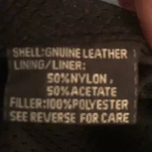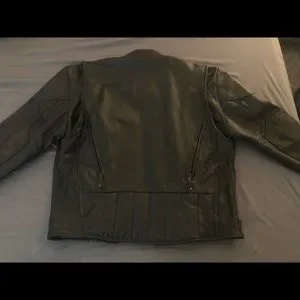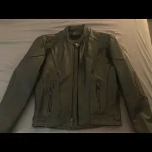 Heavy, Leather, riding jacket. No idea what brand. Many pockets!