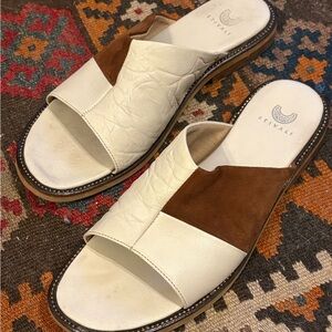 Pressed wood and rubber sole with a mix of leather over top: brown suede, smooth white leather, and a textured white leather. Gold chain perimeter detail. Beautifully and ethically made shoes. Right logo shows wear and tops crinkle in slightly. Size 39, fits like a 9.5.
