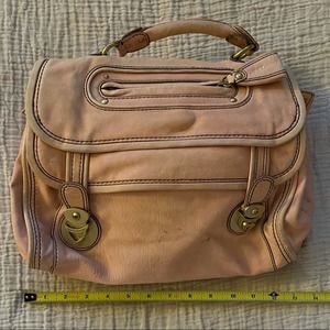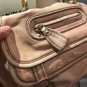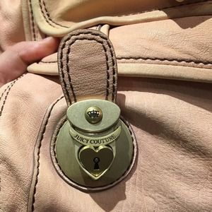 Juicy Couture Satchel in 100% genuine leather (which is so buttery soft!!!), in a very light baby pink color. Has wear at back of bag due to jean wear (see images).