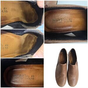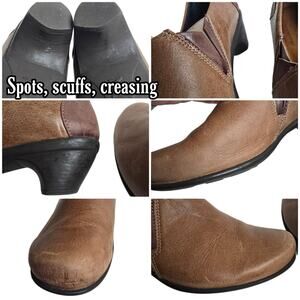 Brown leather upper w/ burnished & distressed areas. Slip on style w/ stretch gores, round toe, chunky heel. Issues noted in photos. Good preowned condition, overall. Size EU41, US Size 10 by Naot.