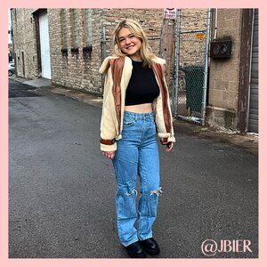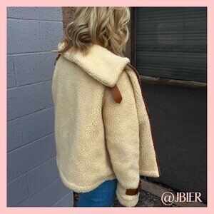 Leather Strap Teddy Jacket features two front zip pockets, exterior fleece lining, front zipper closure, turn-down collar, and buckle detail on the neckline and wrists. Size M. Composed of polyester. Excellent condition.