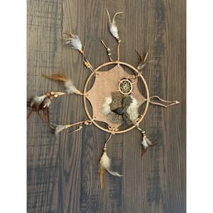 This unique leather stretched authentic dreamcatcher features a charming moose accent, adding rustic and natural charm to any space. Perfect for bedrooms, living rooms, or cabin décor, it brings a cozy and whimsical touch. The handcrafted design highlights quality and attention to detail. Ready to hang, it is ideal for decorating walls or gifting to nature and wildlife enthusiasts. The dreamcatcher is in good used condition. Great item!! Great value!!