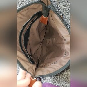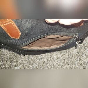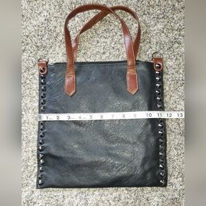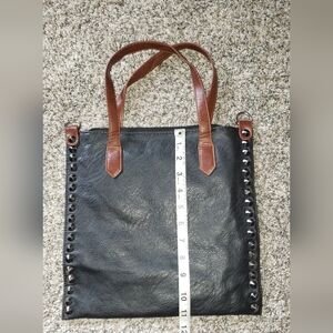 Stylish black tote bag with brown handles and studded accents. Perfect for everyday use. Has extra placements for another handle to make it a cross body but does not come with. There is a small stain on the inside of the bag from a pen but still a fully functional and great bag.