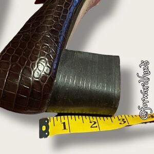 The heels measure 2 1/2 inches, providing just the right amount of height for both style and comfort. The shoes are in a size 10 1/2 M, making them an excellent choice for anyone looking for a refined addition to their wardrobe. There is some red marker writing visible on the soles, but this does not impact their wearability or overall appeal.