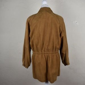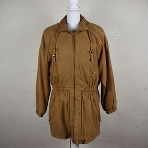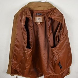 Has some wear but is overall great condition! Intact, has a removable vest inside that you can unzip. Four pockets and an adjustable waist!