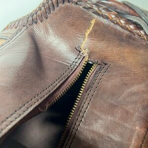 This is a gorgeous Leather Tightly Woven Wicker Extra Large Double Handle Shoulder Strap Travel Bag. Leather Strap and buckle closures. Snap pockets on either side. Flap and full zipper closure. Fully lined interior. Wall zipper pocket. A small tear in the interior leather, can easily be fixed and does not impact the perfectly working zipper closure. No odors. A small spot in the interior of the flap, almost unnoticeable. This piece is hand made as you can tell by the interior stitching. Outer leather whipstitching is all intact.