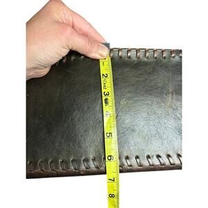 Leather Tote Shoulder Bag Large Purse Dark Brown Leather Cord Stitching Accents Unbranded with a made in Indonesia sticker inside. Lined with fabric and has a zip internal pocket and a snap closure as well as a way to tighten the leather cords at. top. Seemingly unused. It could possibly be vegan or faux leather, but I am unsure. It's relatively stiff and in EUC. See pics for measurements and condition confirmation.