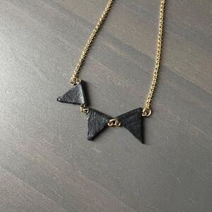Handmade necklace. The three triangles are real black leather. Chain material is unknown (faux gold). Total length is 19.5"