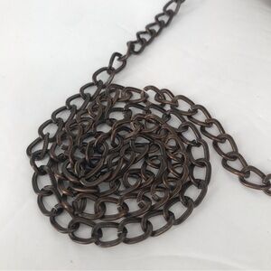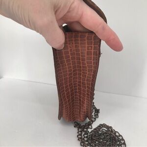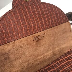 Leather Vintage Handbag with Modern Crossbody Chain. Mundi Brand faux croc Stamped Cognac colored leather bag. Snap closure. Single interior compartment. Missing original strap so I incorporated a complimenting copper chain strap. It is technically detachable but I wouldn’t recommend it often, as it could stretch out the openings where the chain enters the bag. You could tuck the chain inside, though it would still show, see last two pics. Strap drop 21.5”