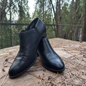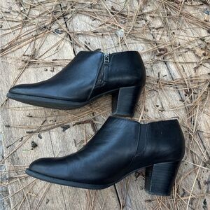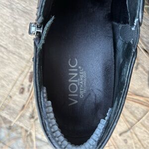 Black leather Vionic booties. Comfortable and stylish with slacks, jeans, dresses. Side zippers. Enlarge photos for wearing and materials. Smoke free and pet free home. Purchase two or more items from my closet and receive a discount. Reasonable offers are considered.
