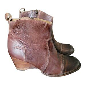 These leather ankle boots have a wedge heel that measures 2 7/8 inches at the back and a side zipper. The sole measures 3.5 inches at its widest point, and the insole is about 10 inches. These show normal wear on the soles and leather but overall are in great condition. Be sure to look at all photos for a complete description.