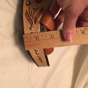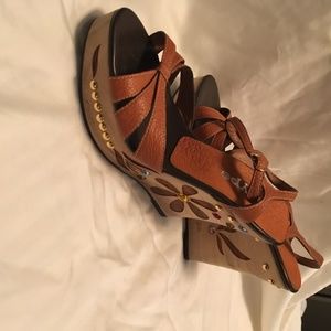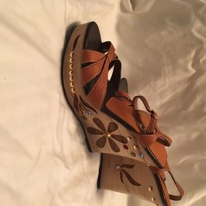 HYPE brand fun strappy wooden wedge shoes that are embellished with gold studs and multi colored embedded stones. These shoes also have flowers and leaves cut into the wood. As you can tell by the soles of these shoes they were not worn much. You won’t be able to wear these shoes and not be noticed. They look great with dresses or a pair of jeans with a graphic T.