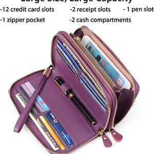 Features: Made from genuine leather, this wallet is soft yet durable with beautiful stitching and quality metal details on the snap, zipper, and handle. It features RFID blocking tech to keep your personal info safe from scan theft. The zip-around design includes a detachable wristlet strap, making it perfect for travel, shopping, or everyday use. Spacious interior with 12 credit card slots, 2 receipt slots, 1 zipper pocket, 2 cash compartments, and a pen slot — plenty of room for your cards, cash, receipts, IDs, and even family photos.