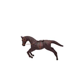 This Leather-Wrapped Horse Statue Figure measures 16 inches long by 10 inches tall, making it a striking, detailed piece for any equestrian enthusiast's collection.