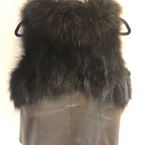 Authentic fur and charcoal leather vest with contemporary metal ring closure. Fur is dense and velvety smooth. Dyed black with silver tips. Ring closure has black leather ties for an adjustable fit. No identifying manufactures label. Fit good for small to medium sizes. Purchased from an importer.
