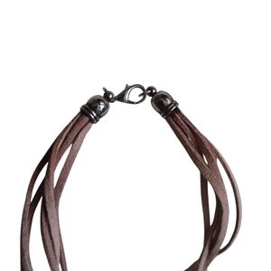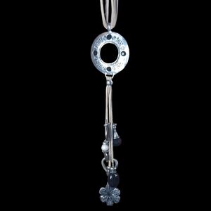 This eclectic necklace features a stunning silver tone pendant on tan leather cords, perfect for adding a touch of sophistication to any outfit.