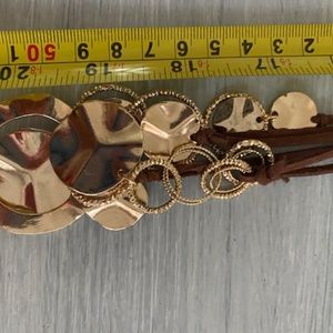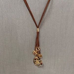 Such cool color combo--shiny gold rings with a "leather"---it's like a really soft rawhide "chain." The bead moves up or down to adjust the look. NWOT. Never worn. Never polished, no tarnish. 20 inches. Perfect for work or a night out.