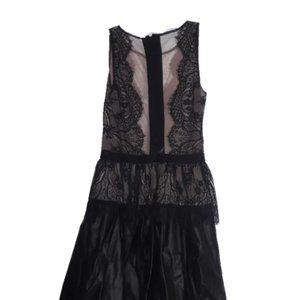 Leather and lace dress in A line style with lace peplum. No size is on the dress but looks like a small. Bust measurement is 15 inches. Length is 32 1/2 inches. Zipper in the back. Like new condition, the bottom just needs a little ironing. Offers and questions are welcome! bundle for a private discount!