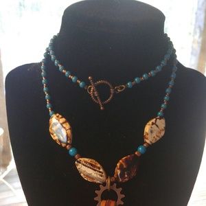 Brown leather straps wraped in copper. Blue and copper beads hand strung with larger white and brown stones . A toggle brass clasp finish this piece. Can be wrapped as seen in photo or worn longer. New item Handmade item.