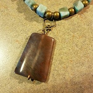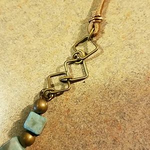 Purchased in a gift shop in Estes Park last year. Brown leather, with turquoise and bronze beads. Not for sure what kind of stone the large one is. Beautiful necklace. Looks awesome with denim