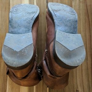 These brown leather boots came already distressed and were regularly and recently cleaned with Saddle Soap. Genuine leather, super comfortable pull-on boots. They go great with dresses, jeans, and leggings