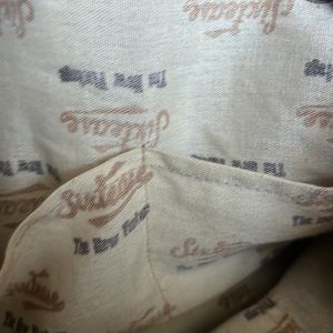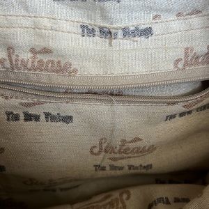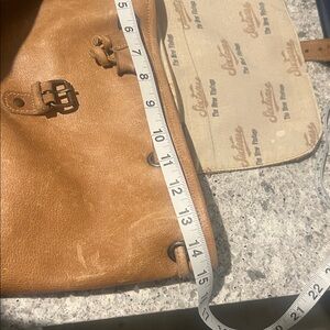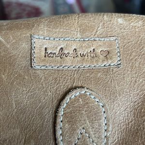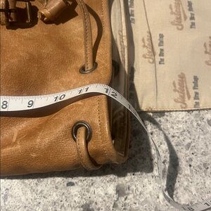 This is a leather full size leather backpack purse. Not sure of the brand, purchased at local boutique. The bag has a drawstring closure with buckle closure, as well. The bag also has two inner pockets for cell phone and a zippered pocket. The leather on the purse is lighter tan, and it has been treated. It does have a weathered look.