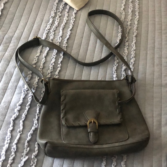 Only used once or twice it’s a grayish color with brassy buckles perfect Color for fall!