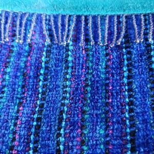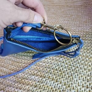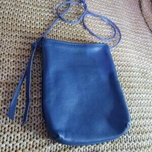 Unbranded but very good quality leather. Striped knit fabric inset, suede band and interior, beaded fringe, leather pull on zipper, brass hardware, braided cord strap, attached inner key ring. Excellent condition.