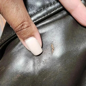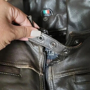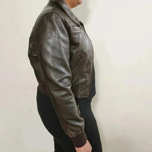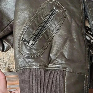 XL fits like an S/M small imperfection under the collar of the back of the jacket.Worn a handful of times.Brown faux fur lining in the upper jacket. The jacket has two side pockets, one top pocket (right), one pocket on (left sleeve and a buckle under the front collar.Tags: leather, bomber, biker jacket, jacket, fall, winter, spring