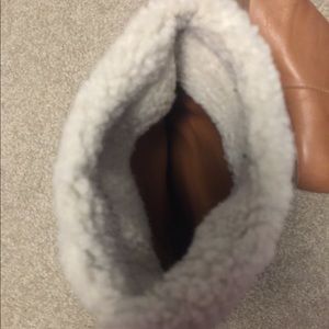 Camel leather with rubber sole and faux fur lining...used but in good shape. Can roll top down further.