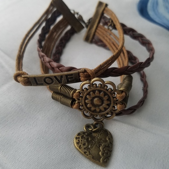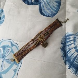 Leather bracelet stack with several charms. Size adjustable by chain. Never worn, in excellent condition!