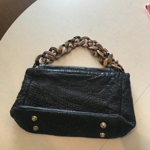 Black leather clutch with unique strap/handle. Purchased from Anthropologie. It great condition with red lining and zip pocket.