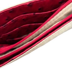 Small red with black dots 3 compartment clutch purse with extra strap. Has card holder and 3 zippered compartments. Measures 8” length and 5” height. Item is new without tags.